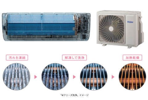 手入れが困難な室内機および室外機の熱交換器を清潔に保つ、独自の「Wフリーズ洗浄」機能を備える。蓄積した油汚れやホコリをマイナス18℃まで凍結させ、一気に解凍した水で洗い流すことで、付着した汚れを除去する。 洗浄の仕上げには、56℃の高温で熱交換器をしっかり加熱乾燥。内部の水分を取り除くことで、カビが発生しにくい状態とし、熱交換器の汚れによる無駄な電力消費を防ぐという。