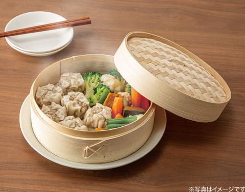 鍋の湯気を利用して食材を温めたり火を通したりできる竹セイロ。20cmサイズは、肉まんやシュウマイ、カット野菜などを並べやすく、日々の食卓で「一品作る」「温め直す」といった用途に使いやすい。
