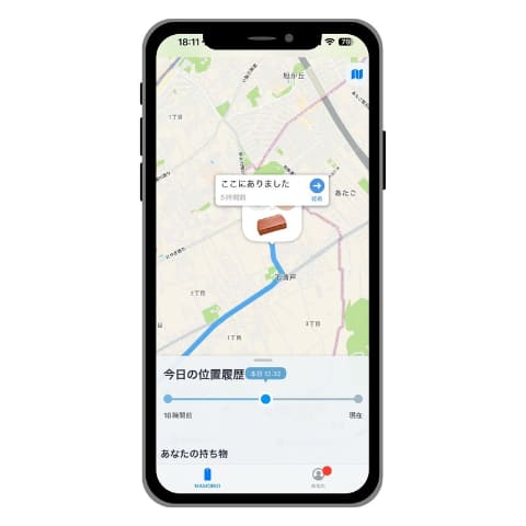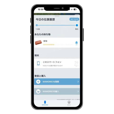 専用アプリ「MAMORIO」と連携し、スマートフォンから持ち物の所在確認が可能。最後にあった場所や移動履歴を地図上で確認できるほか、一定距離離れると通知する機能も備える。