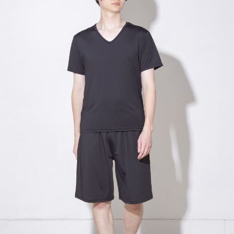 「MENS 着るだけで疲労回復リカバリーウェア VネックTシャツ(NミラクDRY)」の価格は1,490円。サイズはM、L、LL。カラーはグレーとブラック。一般医療機器届出番号は27B2X00365000008。