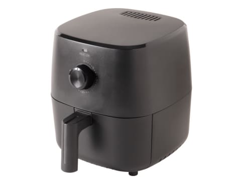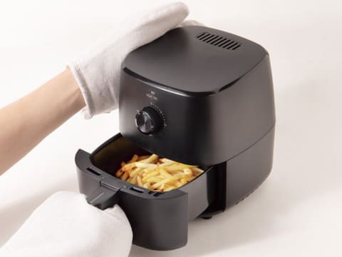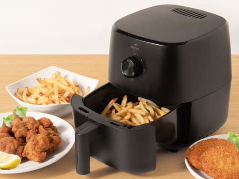 A4サイズを下回るスペースに設置できるコンパクトなエアフライヤー。最高180℃の熱風を高速で循環させることで、外はサクサク、中はジューシーに焼き上げる。