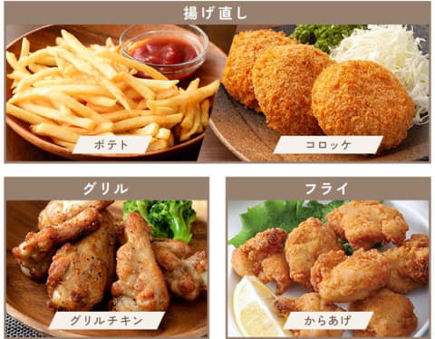 操作は時間設定ダイヤルを回すだけのシンプル設計。少量のフライやグリル調理、揚げ物の温め直し、冷凍食品の加熱まで幅広く対応する。