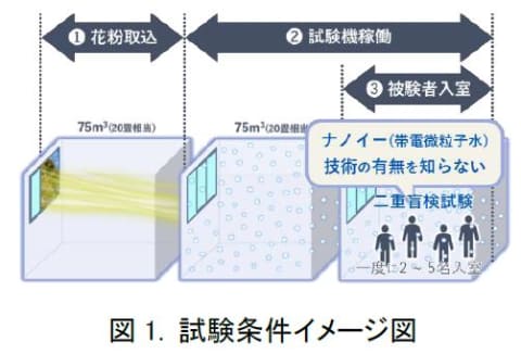 今回の検証では、実使用に近い環境を想定し、自然飛散の花粉を取り込んだ約20畳の大空間に被験者が入り、ナノイー(帯電微粒子水)技術の有無による症状の変化を評価した。被験者は、スギ花粉による鼻症状の自覚がある18歳~65歳の男女101名。