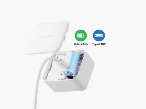 280mAhのリチウムイオン電池を内蔵し、従来の電池交換(CR2型)の手間やコストを削減。USB Type-Cで充電でき、フル充電時には最大約6カ月間(1日1回の動作想定)の連続使用が可能。