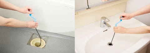 ハンドルをくるくる回すと、回転の力で汚れにしっかりアプローチ。チカラを入れなくても、ドロドロ汚れやアカ汚れを効率よくかき取るという。全長約93cmで、シンク/風呂/洗面台など家庭の排水管にすき間なくフィットし、見えない奥まで掃除できる。