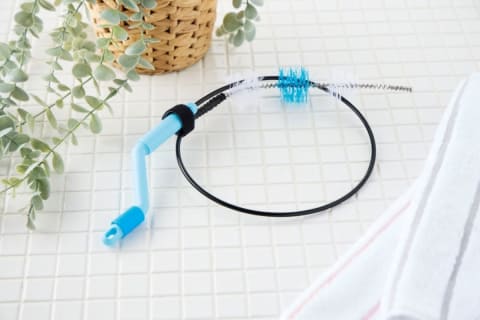 ハンドルを回すとブラシが回転し、奥にたまった汚れをこそげ落とす排水管の掃除用ブラシ。2種類のブラシを採用しており、白のソフトブラシはヌメヌメしたドロドロ汚れに、青のハードブラシはこびりついた頑固なアカ汚れに対応する。