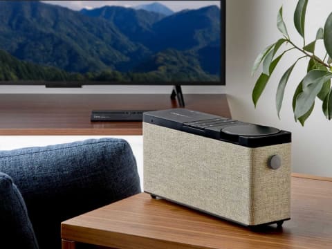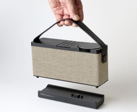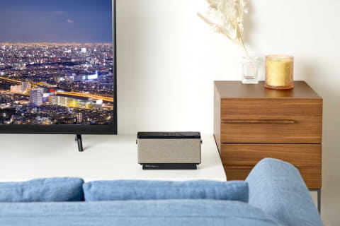 テレビの音声を手元で聞くことができるスピーカー。ベースユニットをテレビと有線接続し、本体のワイヤレススピーカーを好きな場所に置いてテレビを視聴できる。使用後はベースユニットへ戻して充電を行なう。