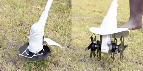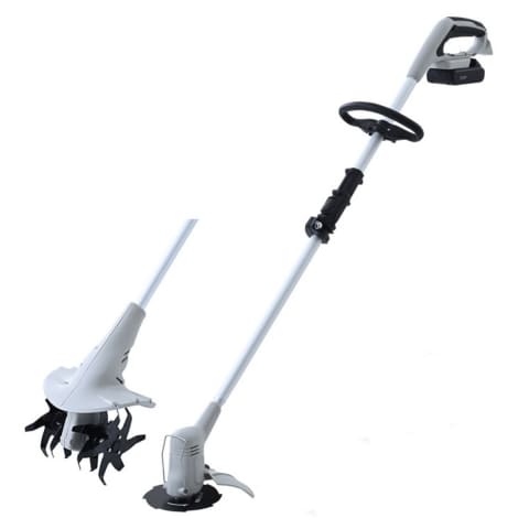 「充電式グラストリマー・カルチ2点セット」は、先端アタッチメントを付け替えることで、草刈り(グラストリマー)/耕うん(カルチ)が可能。複数の機器を使い分ける必要がなく、省スペースで収納でき、効率的に庭仕事ができるという。