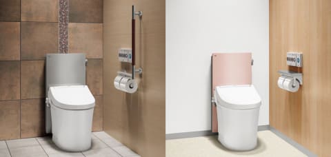 便器は2色、タンクは5色を用意。タンクは床の近くまで伸びたフロントパネルを採用したデザインで、便器とタンクのカラーを変えたツートンカラーのコーディネートが楽しめる。