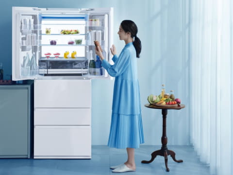 チルドルーム/野菜室/冷凍室の全室に、同社の最新鮮度保持技術を余すことなく搭載した5ドア冷凍冷蔵庫。長期の冷凍保存に最適な「旬鮮冷凍」機能を、冷凍室に新たに搭載。通常運転時よりも低い温度で保存することで、すぐに食べない肉や魚介、買いだめした冷凍食品などの鮮度と美味しさを守る。