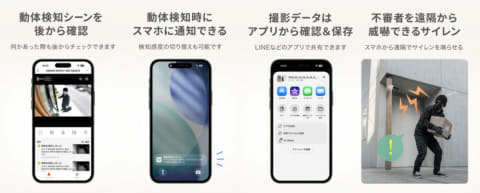 人感センサーを搭載しており、人の動きを検知すると自動で録画を開始し、スマートフォンへ通知を行なう。専用アプリを使えば、外出先からでもリアルタイムの映像確認や録画データの再生が可能。旅行中や仕事中でも、自宅や駐車場の状況を手元で確認できる。