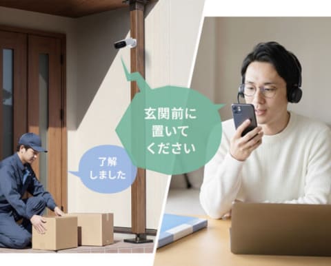 さらに、内蔵マイクとスピーカーにより、スマートフォンからリアルタイムの双方向通話が可能。遠隔操作で訪問者への対応や不審者への警告などを行なうことができる。