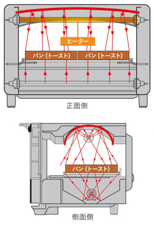 3Dドーム構造に加え、庫内をアルミ鏡面仕上げにすることで熱を効率的に反射し、食材にムラなく熱を伝える。また、0.2秒で発熱するグラファイト式ハイスペックヒーターを上下に搭載。高温で一気に焼き上げることにより、約60秒でトースト1枚を“外はサクっ、中はもちっ”とした食感に仕上げる。なお、1度にトーストできる枚数は2枚。
