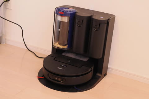充電ドックにはサイクロン式の自動ゴミ収集機能を備え、掃除後のゴミを集める。10個の強力なルートサイクロンにより、ゴミと空気を分離しながら回収するため、本体の吸引力低下を防ぐ。ドックのダストビンには最大100日分のゴミをためられ、1つのボタンでゴミ捨てが可能。紙パックを使わないため交換の手間もないという。