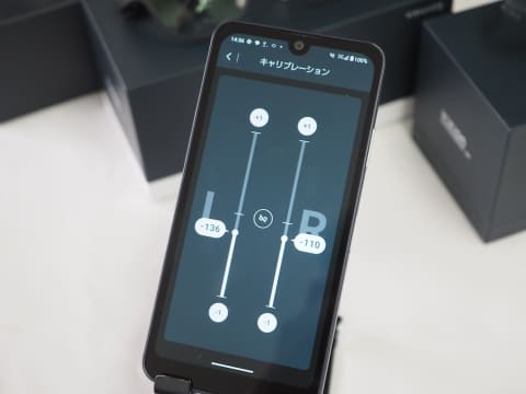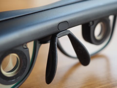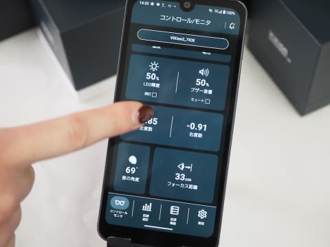 レンズ位置の調整後は、本体の左右側面に目の焦点を手動で合わせるためのレバー(ポッチ)を、前後に倒すことで、左右それぞれのピントを合わせる。ピント調整は、Bluetooth接続したスマートフォンの専用アプリでも可能。
