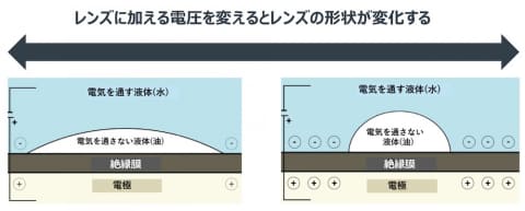 同機で採用されている液体レンズは、電気を通す液体(水)と電気を通さない液体(油)で構成されている。この、レンズとなる液体に加える電圧を変えることで、レンズの形状を変化させ、焦点が合うようにしている。そのためカメラのような駆動音がない。