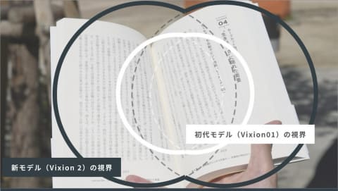 現在の課題としては、液体レンズの径が9mmであること。同機を装着すると、液体レンズの枠が視界に入ってしまう。そのため、一般的なメガネとは、また異なる使用感。ただし、数年前に発売された初代モデル(ViXion01)では径が小さく、それと比較してViXion 2は約2.4倍に拡張されている。