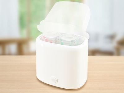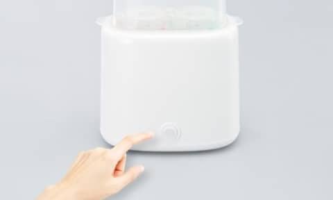 本体に水を入れてボタンを押すだけで、哺乳びんや小物類を除菌できるスチーム除菌器。除菌には水50mlのみを使用し、熱湯や薬液は不要。手間をかけずに衛生管理ができる。