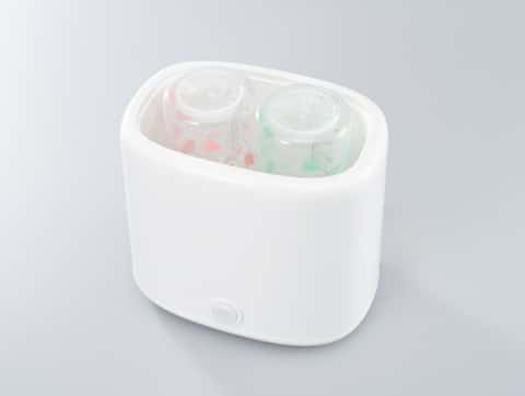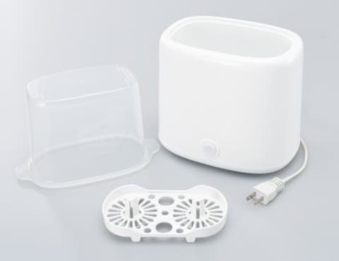 一度に高さ20cm以下の哺乳びん2本が入る。乳首やキャップ、おしゃぶりなどの小物もまとめて除菌できる。除菌時間は約15分で、終了後は自動で電源がオフになる。