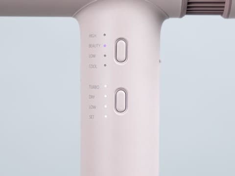 風量はTURBO/DRY/LOW/SETの4段階で調節できるほか、HIGH/BEAUTY/LOW/COOLの4モードを切り替えられる。その中のBEAUTYモードでは、温度と冷風を自動で切り替え、髪をいたわりながらツヤのある仕上がりへ導くとしている。