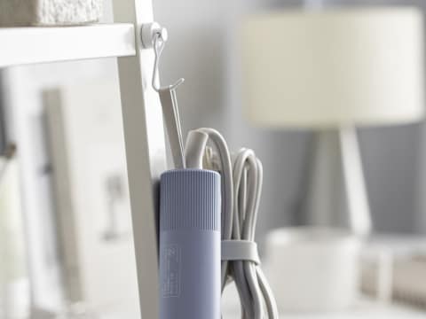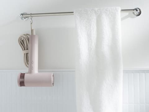 合皮素材のループを備え、洗面所や部屋のラックなどに掛けて収納できる。
