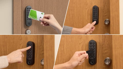 キーパッドでは、指紋認証、暗証番号、交通系ICカードなどでも解錠設定が可能。精度99.95%、解錠速度約1秒の指紋認証は、スマートフォンに不慣れな子供やお年寄りに適しているとする。また暗証番号は、通常のパスワードに加え、期間限定パスワード、ワンタイムパスワード、覗き見防止パスワードが設定できる。