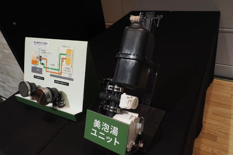これまで22年間で10万台以上の販売実績を持つ従来の「酸素美泡湯」は、酸素を含んだマイクロバブルを発生させるものだった。新たにエコキュートの名称「eco」と酸素美泡湯を組み合わせたものとして名称を「美泡湯eco」とした。ポンプで加圧した湯に溶解タンクで空気を溶け込ませ、ふろ接続アダプターで減圧させることで、マイクロバブルを発生させる。