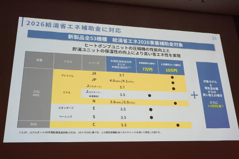 省エネ性も向上。JPシリーズにおいて、年間給湯保温効率(JIS) 4.1の高い効率を達成。さらに、全ての新モデルで給湯省エネ2026事業補助金の対象となる。