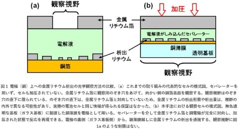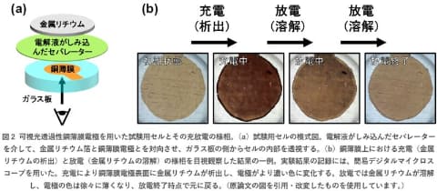 電池は、プラス極とマイナス極とセパレーターの3つで構成されるが、通常は完全に閉ざされているため内部を直接目で見ることはできない。そこで電極の一部を非常に薄くし、光を通すことで内部観察を可能にした。条件を工夫することで、電気伝導性と可視光透過性を両立する、最適な銅薄膜の厚みを突き止めたという。