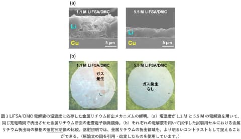 その結果、充電中に電解液の還元分解によってガスが発生し、電池性能に影響を与える様子や、充放電中における金属リチウムの析出と溶解の様相を直接観察できたという。これらは電池の劣化や短絡(ショート)の原因となる。