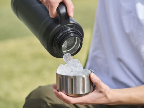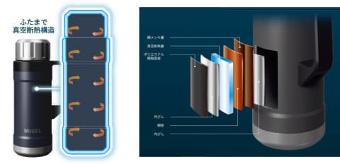 真空断熱構造とメッキ加工を採用し、高い断熱性を実現したマグボトル。特に1,900mlモデルは、蓋部分にも真空断熱構造を施すことで、最大保温約60時間/保冷約80時間、さらに氷の持続時間は約240時間を実現したという。