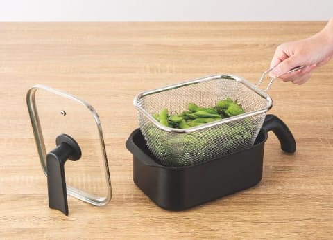 容量は約2.3Lで、2〜3人分の調理に対応。ストレーナー(こし器)には脚が付いており、調理中に一時置きできる。ふたは自立する仕様で、省スペースで扱いやすい。