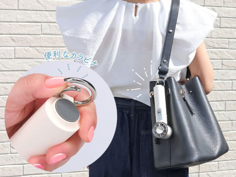 本体下部にはカラビナを備え、バッグなどに吊るして持ち運べる。また机などで使用する際には、カラビナがスタンドとなり、本体を自立させられる。