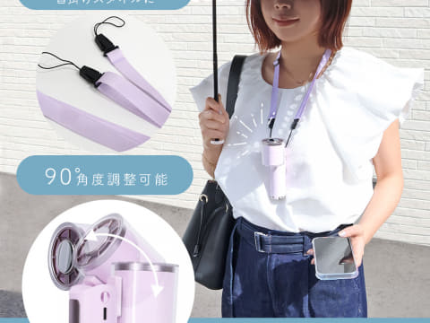 本体のヘッド部分は90度の角度調整が可能。付属のネックストラップを使えば、首掛けスタイルで風に当たれる。