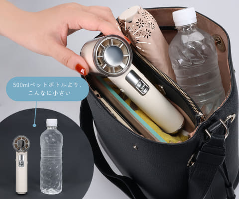 TURBO&JET ハンディファンは、小型ながらパワフルな風量で、持ち歩きやすさが魅力だとする。風量は5段階で切り替えられる。