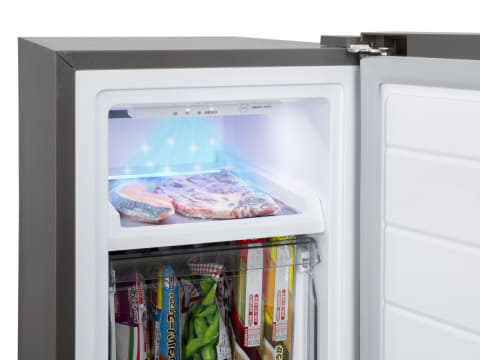 庫内の最上段は、アルミトレイの「自動急冷コーナー」。自動急冷モードをONにすると、センサーで温度変化を検知し、食品を入れると自動で急冷凍を行なう。さらに、自動急冷コーナーの天井面にはUV-LEDを2灯搭載しており、除菌効果も備える。