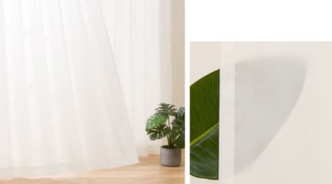 UVカット率99%でありながら光をやわらかく拡散し、室内を明るく保てるレースカーテン。日中は室内が見えにくい遮像機能を備えつつ、従来品に比べてやさしい光を取り込める。