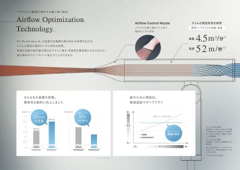 スリムな筒型形状と、パワフルで速い風を作り出す独自の「Airflow Control Nozzle(エアフロー コントロール ノズル)」を採用したドライヤー。風量は最大約4.5m3/分、風速は52m/秒とハイパワーでありながら、本体重量は約280gの軽さを実現。長時間使っても手元にかかる負担が少ないとする。