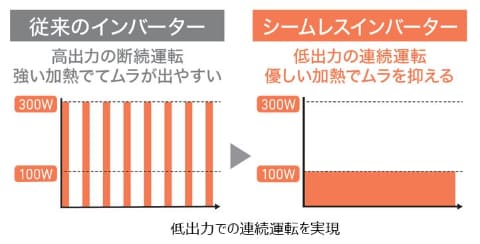 出力制御を改良した「シームレスインバーター」を搭載し、低出力での連続加熱を可能にしたオーブンレンジ。従来の断続加熱に比べて加熱ムラを抑えられるという。