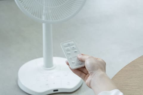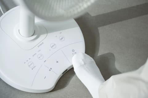 しゃがまずに足で操作できる大きなボタンを備えた扇風機。電源のON/OFFや風量の調節を、足で軽く触れるだけでかがまずに行なえる。