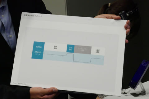 下げDR時は、消費電力が通常30~40Wほどのところ、予冷が始まると90W前後に上昇。DRが始まるとコンプレッサーがオフになり、待機電力のみの10W未満に下がる。DRが終わると庫内冷却のために一時的に90W近くまで上昇することもあるが、総合すると下げDRのために通常よりも電気代が高くなることはないという。
