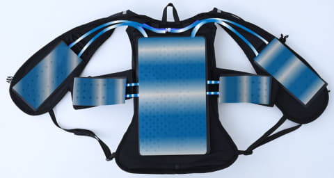 冷やした水をウエア内に循環させて体を冷却する水冷服。従来のチューブ式から進化し、背中を面で冷やす「水路式構造」を採用した。また、通気性にも配慮し、冷却部には穴あき構造を取り入れることでムレを軽減。吸水性の高い素材で水路表面を覆うことで、広い面積を効率よく冷やしながら快適な着用感を実現する。