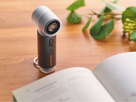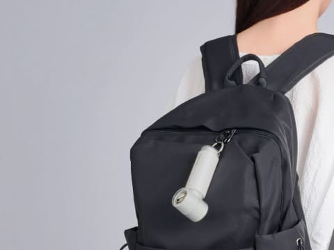 本体の下部にはカラビナが一体化しており、バッグやベルトループに直接取り付けてアクセサリー感覚で持ち運べる。必要な時にすぐに使えるだけでなく、バッグの中で探す手間や置き忘れを防止する。さらに、このカラビナ部分は机などに置く際の自立スタンドとしても機能する。