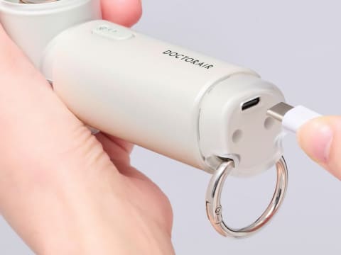 電源はUSB Type-Cからの充電式で、満充電までにかかる時間は約2時間。連続稼働時間は、最小風量時で約7時間、最大風量時で約1時間20分。また、充電残量表示ランプを備え、突然の充電切れを防げる。