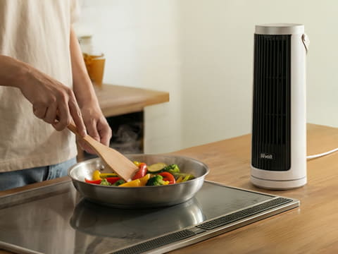 約1.2kgの軽量設計とスリムな形状に加え本体に持ち手を備え、小型化と持ち運びやすさを両立したモデル。キッチンや脱衣所、デスク周り、寝室など、必要な場所へ手軽に移動して使用できる。