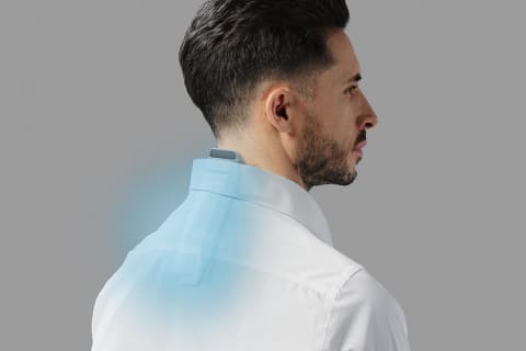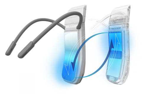 本体内部の熱を服の外へ逃がす、付属のエアフローパーツも進化。伸縮して角度調節もできるアジャスタブル形状となった。人によって異なる首元の形状や好み、着用する衣服の襟の高さに合わせてエアフローパーツが調節でき、周りから目立たず効率的に排気して冷却性能を保つ。