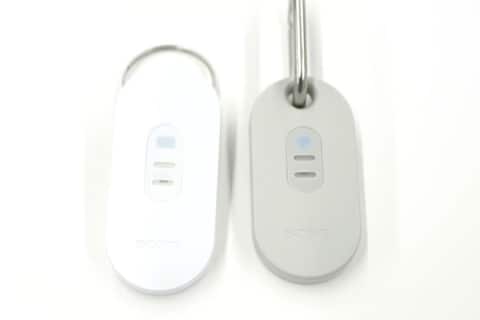 RNPK-P1PTに同梱するセンサーのREON POCKET TAG 2 RNPT-2は、従来比で約18%小型化して持ち運びやすくなった。本体背面のクリップに代わり、上部に新たにストラップホールを設けた。同梱されたカラビナを使えば、バッグやベルトループなど、好みの場所に装着できる。タグ単体でも販売され、市場想定価格は3,850円前後。