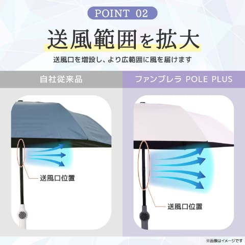 日傘のハンドル部分から吸気し、シャフトの送風穴から風を送り出す構造を採用。前モデル比で風速を約20%向上し、顔や首元にしっかり風が当たり、涼しさを感じやすいようにした。