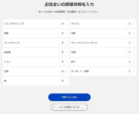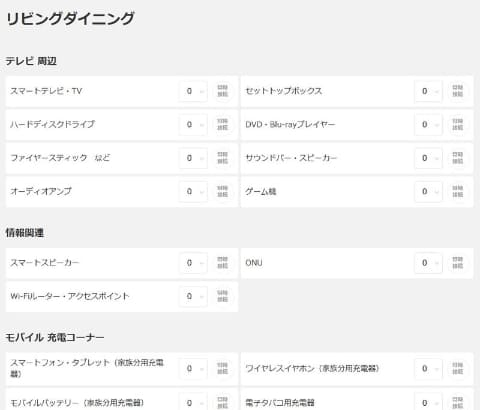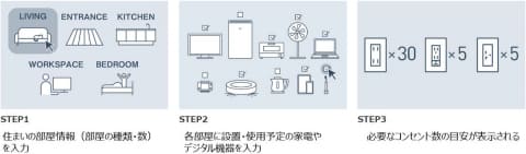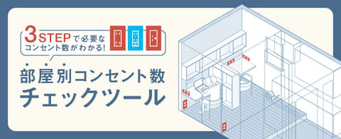 新築やリニューアル時に、コンセントの数や配置を検討する際に活用できるツール。部屋の種類や数、使用する家電やデジタル機器を入力することで、必要なコンセント数を自動で算出できる。