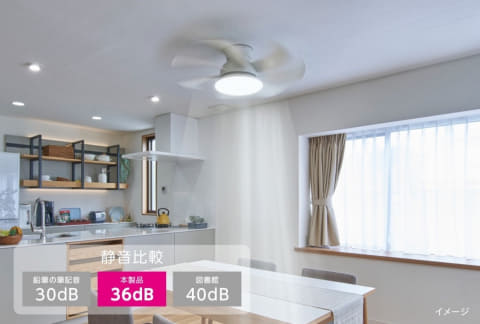 天井から空気循環を促すファン付きシーリングライト。従来品の構造を刷新し、中央に照明、その外側を囲うように7枚の大きな羽根を配置することでシリーズ最大風量を実現。さらに、この構造により風切り音を抑制し、最大運転時でも約36dBの静音性を両立した。